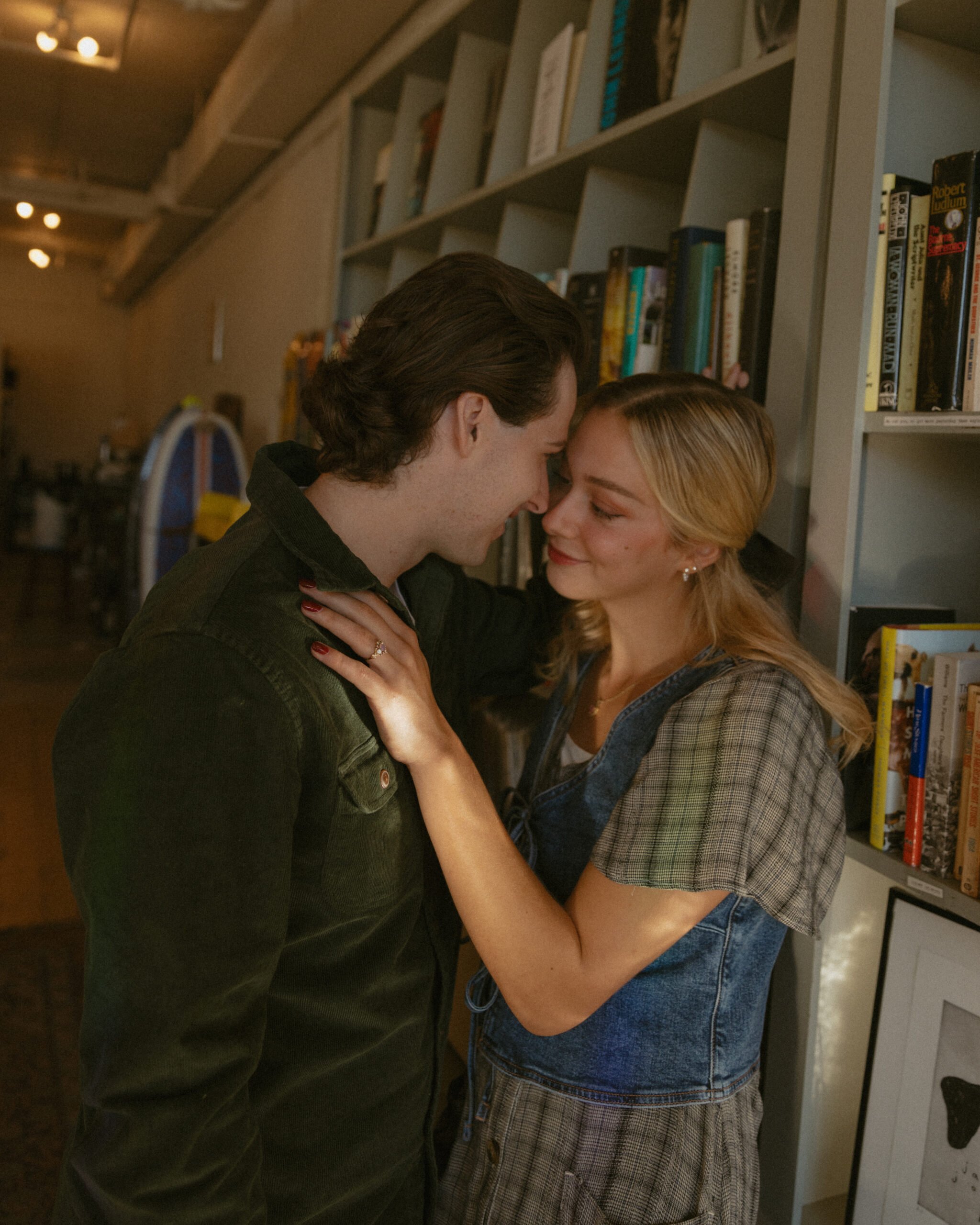 in love at the record shop: colette & jack’s unique & personality filled engagement session